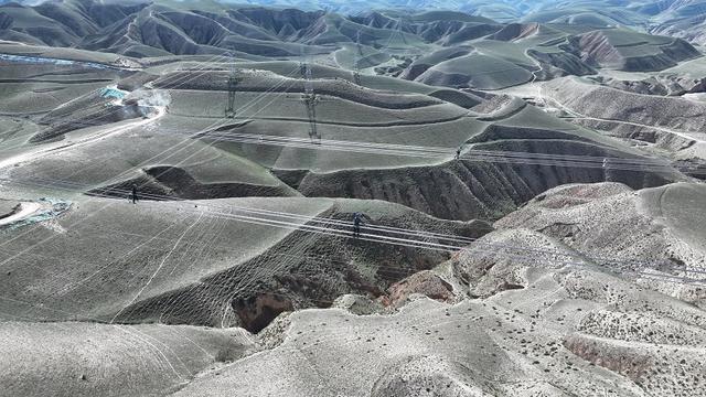國(guó)網(wǎng)甘肅電力施工人員在哈密—重慶±800千伏特高壓直流輸電工程開(kāi)展架線自檢。