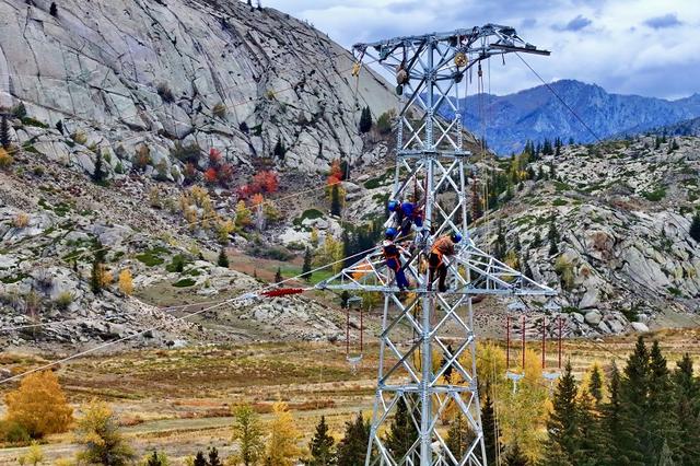 國(guó)網(wǎng)新疆阿勒泰供電公司施工人員在110千伏可可托?;﹫?chǎng)線路工程組塔。
