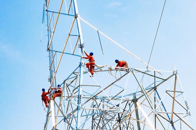 國(guó)網(wǎng)四川電力施工人員在川渝1000千伏特高壓交流工程登塔作業(yè)。