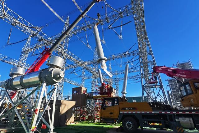 國(guó)網(wǎng)遼寧送變電公司施工人員在巴里坤±800千伏換流站開(kāi)展罐式斷路器安裝作業(yè)。
