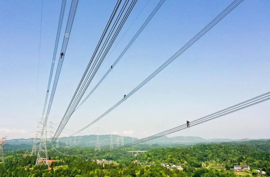 國網(wǎng)重慶送變電公司員工在川渝特高壓工程重慶段線路開展走線消缺