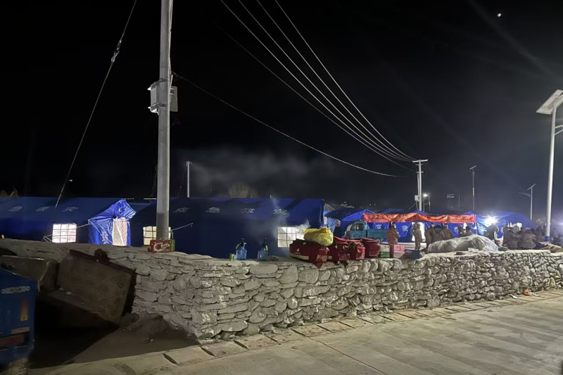 ▲國網(wǎng)西藏電力員工連夜奮戰(zhàn),點(diǎn)亮定日縣安置點(diǎn)帳篷