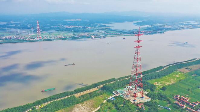 6月18日,隨著南陽—荊門—長沙特高壓交流工程螺山長江大跨越北岸(湖北側(cè))跨越塔最后一段導(dǎo)地線支架安裝完成,螺山長江大跨越首基371米高塔組立完成。螺山長江大跨越新建特高壓跨越塔2基(塔高371米,距地面377.5米),單基塔重4400噸,跨江檔距2413米,耐張段全長3900米,均為特高壓工程之最。