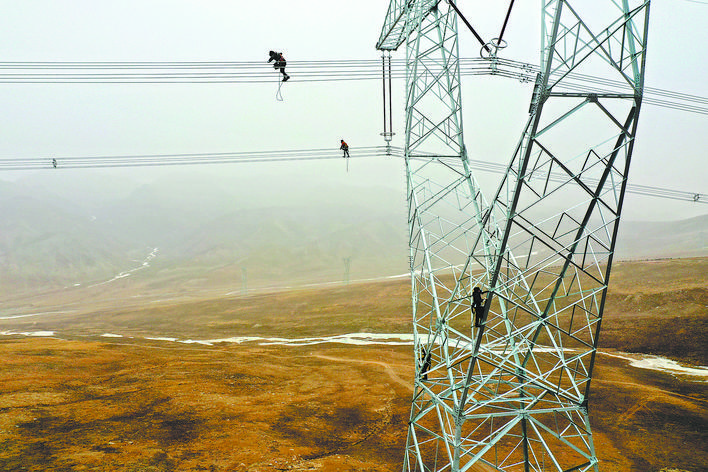 青海省海南藏族自治州,在海拔4000米的拉脊山上,座座鐵塔架起條條銀線。1月24日,在距離地面四五十米的電力線路上,幾個(gè)小小的身影迎著寒風(fēng)健步行走。