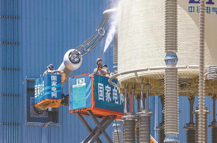 7月5日,檢修人員在延慶換流站沖洗設(shè)備。張笑譚 攝