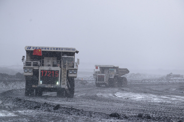 華能伊敏露天礦自卸卡車風雪中保煤炭運輸。資料照片
