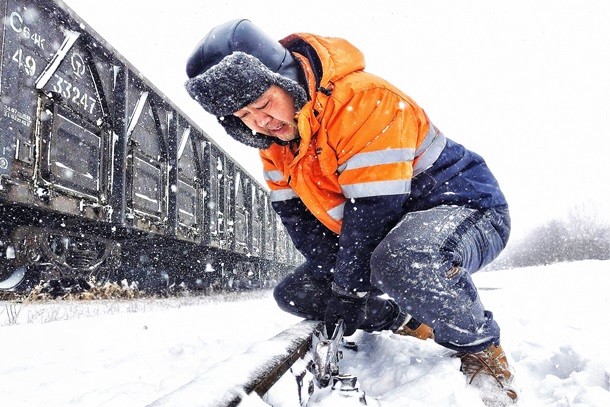 信號工清理鐵道線路積雪