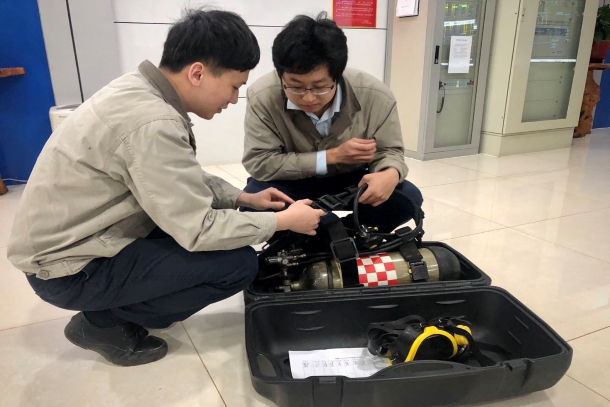 圖為安全員正在講解正壓式呼吸器的正確配戴方法