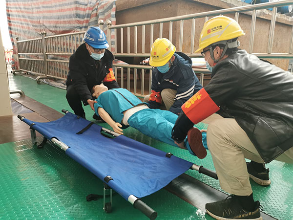 此次演練在主安裝廠2號機(jī)組大修現(xiàn)場進(jìn)行,模擬兩名施工人員在轉(zhuǎn)輪支架3米多高的平臺上焊接縫隙,一名工作人員未系安全帶進(jìn)行作業(yè),不慎摔倒墜落。該公司相關(guān)部門接到報(bào)告后,迅速啟動應(yīng)急機(jī)制,立即撥打120緊急電話,并通知應(yīng)急救援隊(duì)趕赴事故現(xiàn)場。救援現(xiàn)場,應(yīng)急隊(duì)員迅速判斷危險(xiǎn)情況,并檢查傷員傷勢,大家齊心協(xié)力將傷員轉(zhuǎn)移到安全地帶,拉起警戒線,對傷員進(jìn)行緊急檢查。救援人員發(fā)現(xiàn)傷者腿部骨折,無法行動,立即進(jìn)行骨折包扎急救,按部就班、細(xì)致謹(jǐn)慎對傷口進(jìn)行消毒、止血、固定、包扎。最后,傷員被順利送往醫(yī)院。