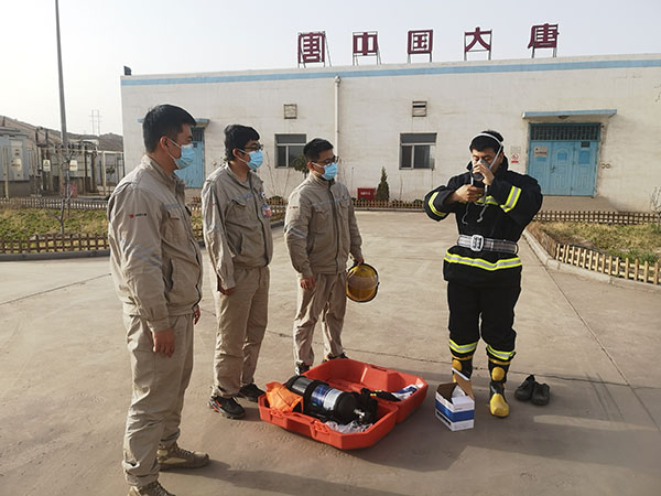 首先開展的是干粉滅火器實(shí)操演練。運(yùn)維人員取出4具即將送檢的滅火器,用小推車裝好干柴放置在空曠地點(diǎn),駐站人員講解了滅火器檢查方法和使用流程后,在確保安全的情況下將小推車內(nèi)的干柴點(diǎn)燃。一名工作人員用滅火器將車內(nèi)的火焰撲滅,再重新點(diǎn)燃,下一名人員繼續(xù)操作,最終達(dá)到參訓(xùn)人員全部能夠熟練使用滅火器的目的;其次,開展正壓呼吸器使用實(shí)操演練。在每個(gè)人都熟練掌握說(shuō)明書上使用步驟和注意事項(xiàng)后,每名工作人員都穿戴正壓呼吸器一次,如果穿戴流程錯(cuò)誤立即糾正并重新穿戴;再次,開展消防戰(zhàn)斗服穿戴實(shí)操演練。有火電消防工作經(jīng)驗(yàn)的人員對(duì)戰(zhàn)斗服使用步驟進(jìn)行詳細(xì)講解,每名工作人員都穿戴消防戰(zhàn)斗服一次,達(dá)到全員均能熟練穿戴的目的;最后,所有參訓(xùn)人員都組裝并佩戴防毒面具一次。