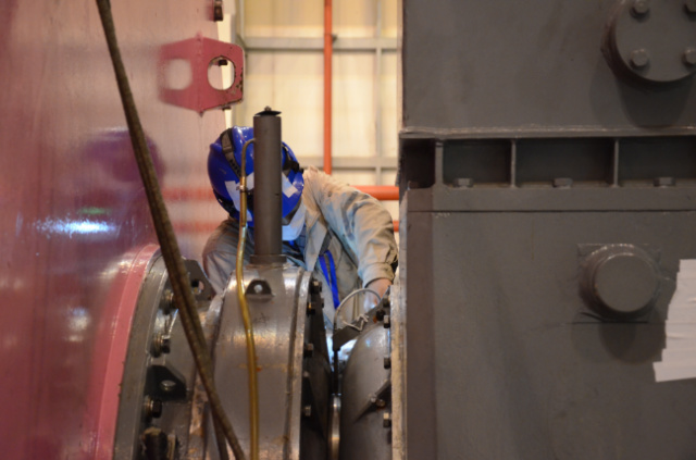 例如作為發(fā)電機(jī)大修相關(guān)項(xiàng)目的最后程序之一——發(fā)電機(jī)勵(lì)磁機(jī)側(cè)下端蓋回裝完成后,還需要檢修人員進(jìn)入到狹窄的發(fā)電機(jī)下部縫隙中進(jìn)一步檢查勘驗(yàn)。此時(shí)作為宣傳人員的我只能站在汽輪機(jī)平臺(tái)上“居高臨下”地去拍攝照片,最終成像出來(lái)的,就是一個(gè)佝僂著的脊背。
