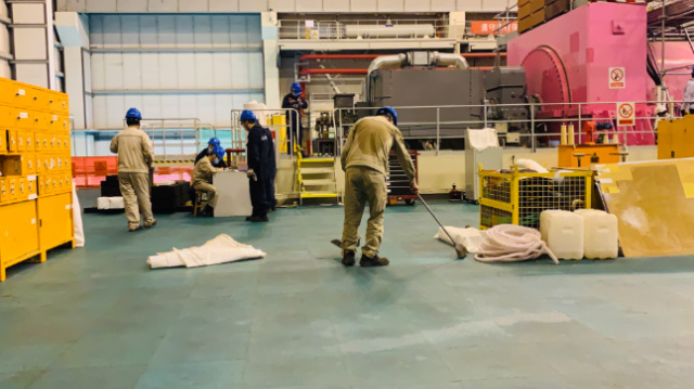 在大修尾聲,我又看到了一個(gè)背影。他正背對(duì)著我,一絲不茍地清潔著剛剛“撤場(chǎng)”完畢后的地面,發(fā)揮著工完料盡場(chǎng)地清的傳統(tǒng)“藝能”——他的衣服已經(jīng)汗透,緊緊地貼在背上,我看不見(jiàn)他的臉,卻依然尊敬地對(duì)著他,舉起了相機(jī)。