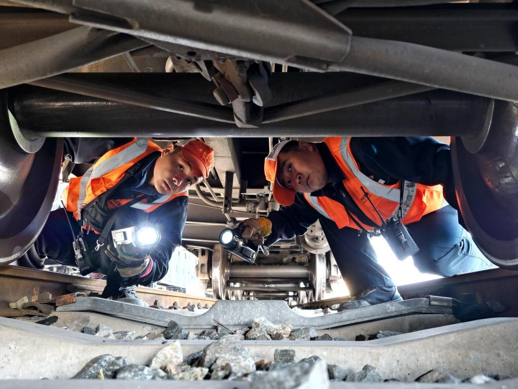 “兄弟,加把勁,這趟車檢完就去吃飯啦。”老劉一邊檢查車輛連接處,一邊和身旁的對敲打趣道。