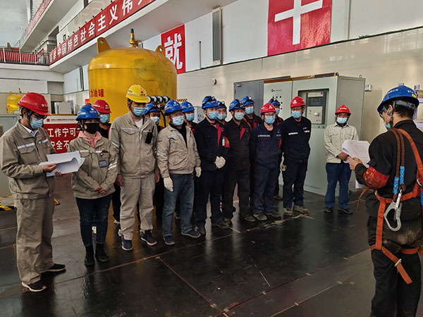 拆除工作開始前,專業(yè)人員、檢修人員、監(jiān)理人員三方按照編制的專項吊裝方案認真核對檢修措施,重點對主橋機供電系統(tǒng)、起升系統(tǒng)、吊具進行檢查。同時組織工作負責人和工作班成員現(xiàn)場開展三講一落實活動,著重對本次吊裝作業(yè)過程中存在的風險點和預(yù)控措施進行現(xiàn)場講解。燈泡頭拆除過程中,由于尺寸原因泡頭與定子基座把合螺栓松開后,未能按照預(yù)期直接放置到專用工具上。檢修指揮部現(xiàn)場研究方案,轉(zhuǎn)變思路,采用單側(cè)著力再逐步調(diào)整另一側(cè)的方案,把干涉區(qū)域盡量避開,整個拆除吊裝歷時5個小時順利完成。拆除吊運期間,該公司各級人員到位監(jiān)督,有效保障了安全措施齊全可靠?,F(xiàn)場檢修人員充分發(fā)揚團結(jié)協(xié)作、不怕吃苦、奮勇拼搏的工作精神,本著精益求精的工作態(tài)度,嚴格執(zhí)行安全規(guī)程、檢修工藝和工序,確保了整個拆除工作萬無一失。