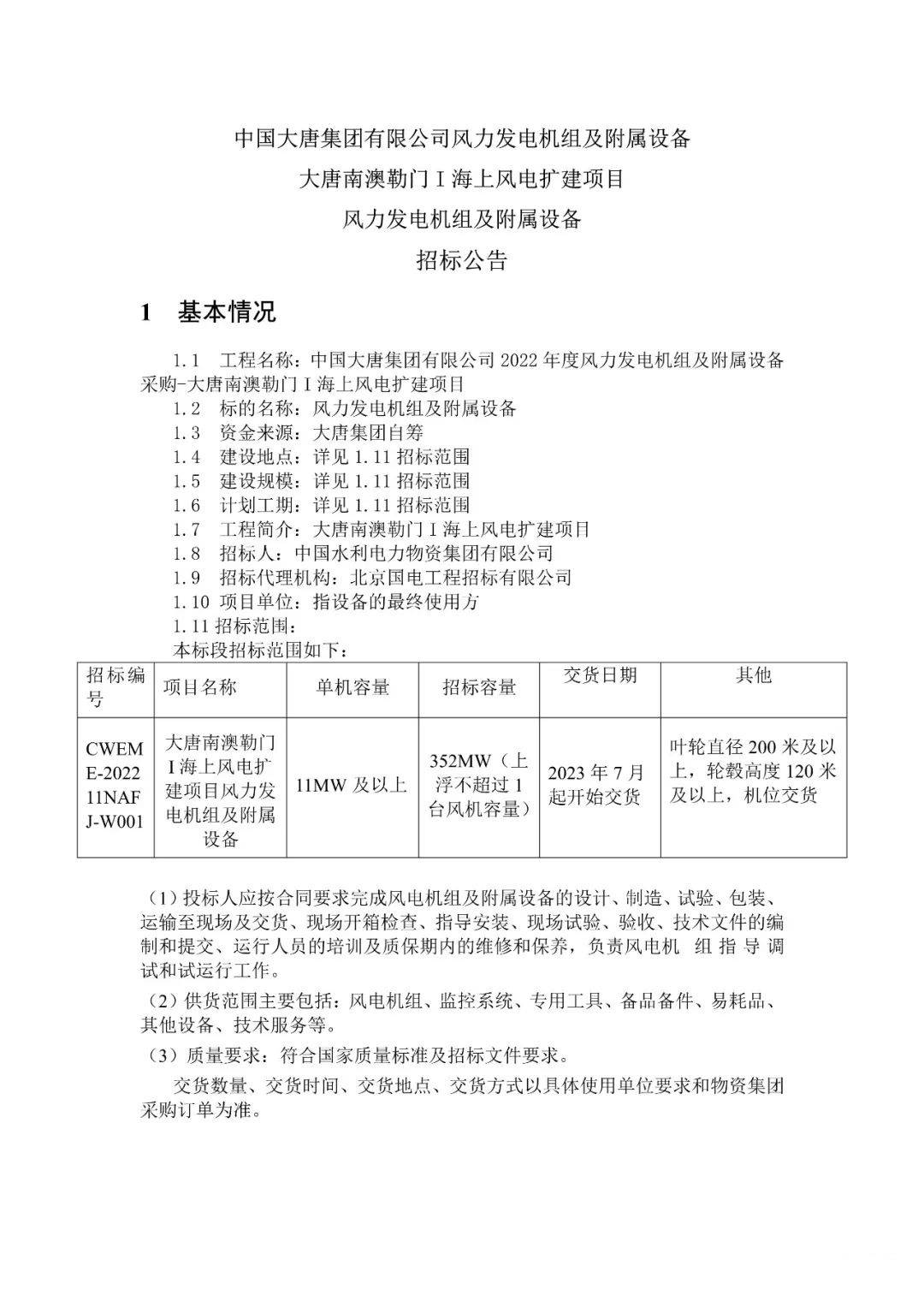 近日,大唐電子商務(wù)平臺(tái)發(fā)布《大唐南澳勒門 I 海上風(fēng)電擴(kuò)建項(xiàng)目風(fēng)力發(fā)電機(jī)組及附屬設(shè)備招標(biāo)公告》。