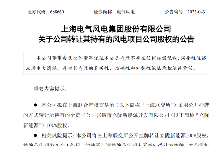 10月21日,上海電氣風(fēng)電集團股份有限公司(以下簡稱“電氣風(fēng)電”或“公司”)發(fā)布《關(guān)于公司轉(zhuǎn)讓其持有的風(fēng)電項目公司股權(quán)的公告》。