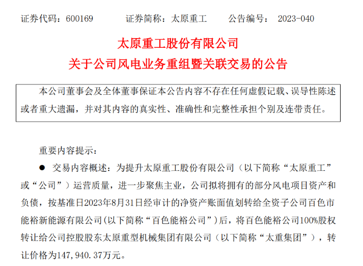 公告披露,太原重工擬將擁有的部分風(fēng)電項(xiàng)目資產(chǎn)和負(fù)債,按基準(zhǔn)日2023年8月31日經(jīng)審計(jì)的凈資產(chǎn)賬面值劃轉(zhuǎn)給全資子公司百色市能裕新能源有限公司(以下簡(jiǎn)稱(chēng)“百色能裕公司”)后,將百色能裕公司100%股權(quán)轉(zhuǎn)讓給公司控股股東太原重型機(jī)械集團(tuán)有限公司(以下簡(jiǎn)稱(chēng)“太重集團(tuán)”),轉(zhuǎn)讓價(jià)格為147,940.37萬(wàn)元。