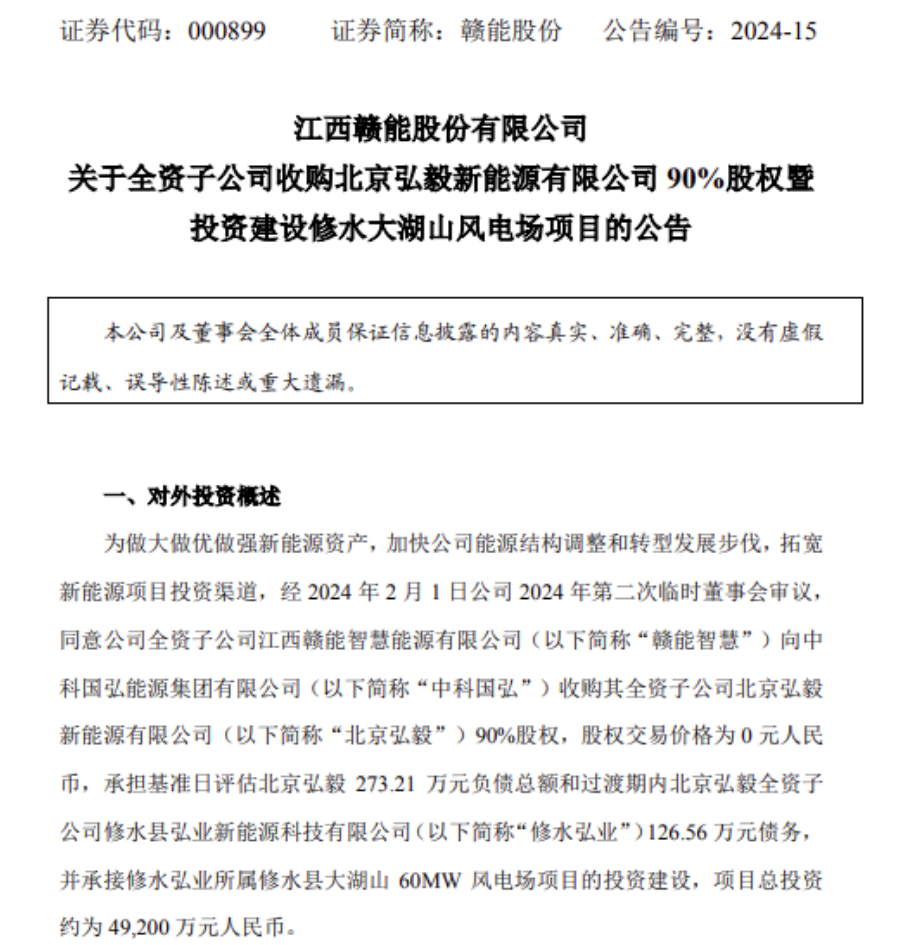 公告顯示,贛能股份全資子公司江西贛能智慧能源有限公司向中科國(guó)弘能源集團(tuán)有限公司收購(gòu)其全資子公司北京弘毅新能源有限公司90%股權(quán),股權(quán)交易價(jià)格為0元人民幣,承擔(dān)基準(zhǔn)日評(píng)估北京弘毅273.21萬(wàn)元負(fù)債總額和過(guò)渡期內(nèi)北京弘毅全資子公司修水縣弘業(yè)新能源科技有限公司126.56萬(wàn)元債務(wù),并承接修水弘業(yè)所屬修水縣大湖山60MW風(fēng)電場(chǎng)項(xiàng)目的投資建設(shè),項(xiàng)目總投資約為4.92億元人民幣。