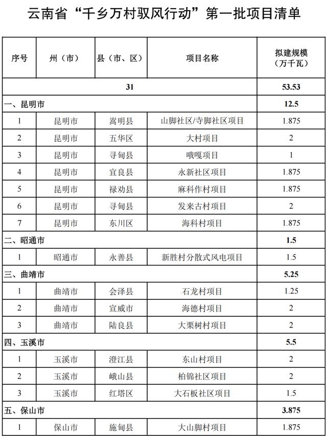 為持續(xù)打造綠色能源強(qiáng)省、大力發(fā)展新能源、助力鄉(xiāng)村振興,云南近日發(fā)布《“千鄉(xiāng)萬(wàn)村馭風(fēng)行動(dòng)”第一批項(xiàng)目開(kāi)發(fā)建設(shè)方案》(以下簡(jiǎn)稱《方案》),將開(kāi)發(fā)建設(shè)第一批共31個(gè)風(fēng)電項(xiàng)目,裝機(jī)容量53.53萬(wàn)千瓦。