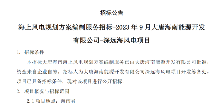 公告顯示,大唐海南能源開(kāi)發(fā)有限公司按照中國(guó)大唐集團(tuán)在瓊“4435”發(fā)展戰(zhàn)略、海南公司“3813”發(fā)展綱要,已完成成為海南省最大的清潔能源供應(yīng)商。下一步,按照海南公司“一基兩翼三極+”發(fā)展新格局,將大力發(fā)展海上風(fēng)電,根據(jù)海南公司海上風(fēng)電發(fā)展需要,編制大唐海南海上風(fēng)電基地規(guī)劃報(bào)告、海南省及東方市海上風(fēng)電上下游產(chǎn)業(yè)鏈發(fā)展規(guī)劃報(bào)告。