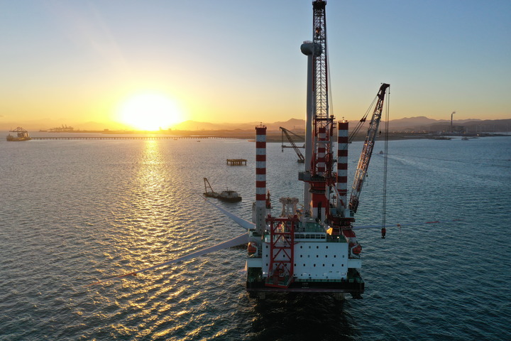 福建福清興化灣二期三峽海上風(fēng)電場10兆瓦風(fēng)機吊裝現(xiàn)場(無人機照片)。新華社記者 林善傳 攝(2020年6月12日攝)