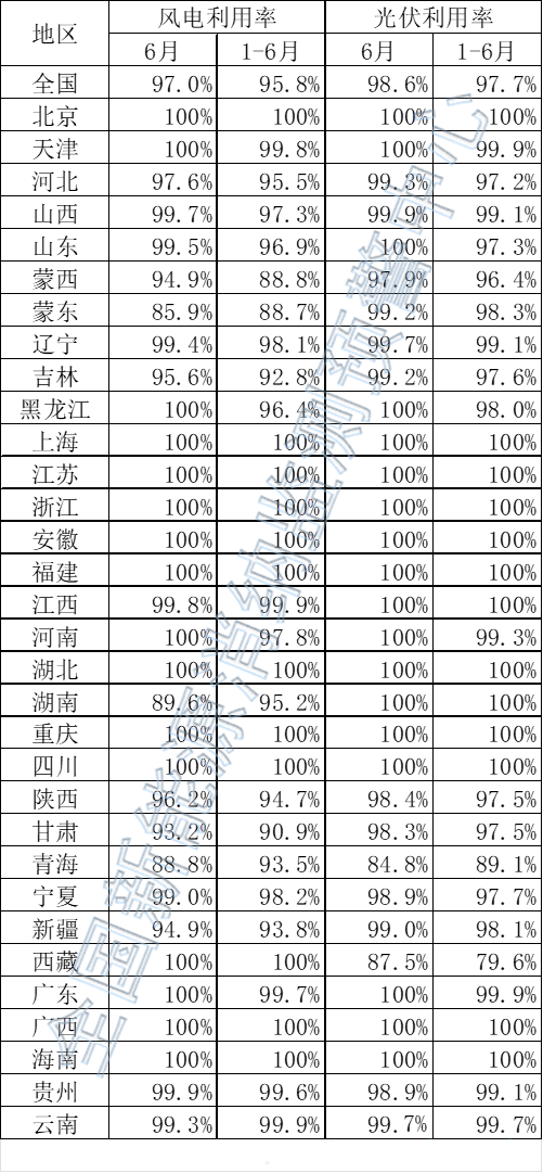 數(shù)據(jù)顯示,2022年6月,全國風(fēng)電、光伏的利用率分別為97%、98.6%;2022年1~6月,全國風(fēng)電、光伏的利用率分別為95.8%、97.7%。