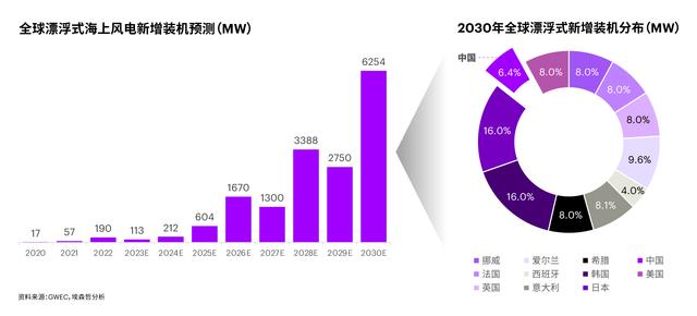 海上風(fēng)電向深遠(yuǎn)海域進(jìn)發(fā):漂浮式風(fēng)電為加速進(jìn)軍深遠(yuǎn)海域開辟了新前景。全球已有202.55MW的漂浮式風(fēng)電項(xiàng)目投運(yùn),2023-2025年將有530MW漂浮式風(fēng)電項(xiàng)目投運(yùn)4。根據(jù)GWEC的預(yù)測,2026年將實(shí)現(xiàn)漂浮式風(fēng)電的商業(yè)化。預(yù)計(jì)到2030年,漂浮式風(fēng)電裝機(jī)規(guī)模將顯著增長,其中中國新增裝機(jī)容量將達(dá)400MW,占全球新增的6.4%。
