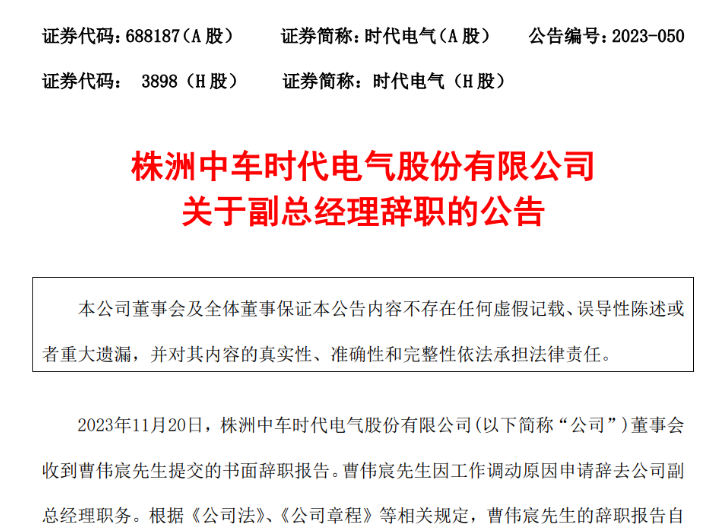 公告披露,2023年11月20日,時代電氣董事會收到曹偉宸先生提交的書面辭職報告。曹偉宸先生因工作調(diào)動原因申請辭去公司副總經(jīng)理職務(wù)。根據(jù)《公司法》、《公司章程》等相關(guān)規(guī)定,曹偉宸先生的辭職報告自送達(dá)董事會之日起生效。截至本公告披露日,曹偉宸先生未持有公司股份。