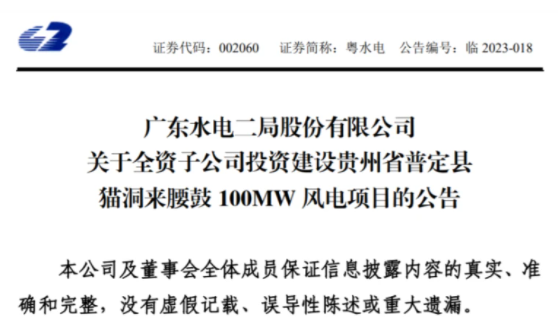 2月10日晚間,廣東水電二局股份有限公司(一下簡稱“粵水電”或“公司”)發(fā)布《關于全資子公司投資建設貴州省普定縣貓洞來腰鼓 100MW 風電項目的公告》。
