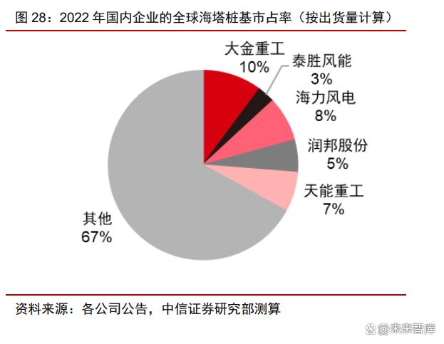 海風基礎(chǔ)高壁壘高門檻,國內(nèi)行業(yè)格局集中。與陸上塔筒的分散格局不同,由于海上 塔筒樁基所需碼頭資源的緊缺和產(chǎn)能布局的重要性,國內(nèi)目前從事海風塔筒和樁基生產(chǎn)的 企業(yè)較少,大金重工、海力風電、天順風能、潤邦股份和泰勝風能為主的少數(shù)領(lǐng)先企業(yè)貢 獻國內(nèi)的主要行業(yè)產(chǎn)能。我們根據(jù)出貨量測算,2022 年主導企業(yè)海力風電、大金重工、 泰勝風能、天能重工、潤邦股份的海上塔筒和樁基的全球市占率合計約 30%。