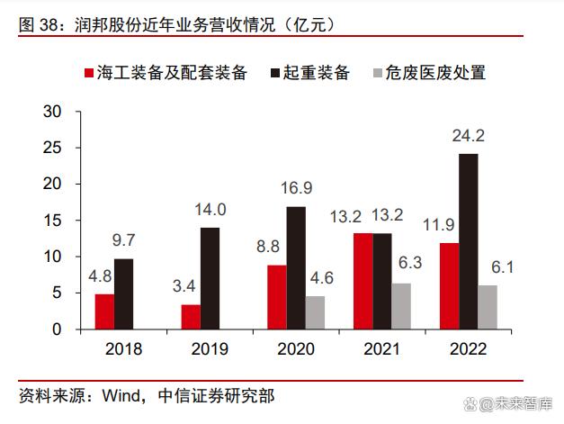 業(yè)務(wù)線豐富,布局高端裝備和環(huán)保板塊。公司主營業(yè)務(wù)分為包括海風裝備、物料搬運 裝備的高端裝備業(yè)務(wù)和包含危廢及醫(yī)廢處理處置服務(wù)的環(huán)保業(yè)務(wù)。2022 年公司海風裝備、 起重裝備、危廢醫(yī)廢處置業(yè)務(wù)分別營收 11.89、24.17、6.07 億元,占比 22.97%、46.71%、 11.73%。公司海上風電裝備業(yè)務(wù)主要產(chǎn)品包括各類海上風電基礎(chǔ)樁、導(dǎo)管架、海上風電安 裝作業(yè)平臺、海洋工程起重機等。