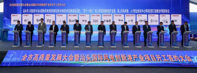 大會(huì)云集了金風(fēng)科技、中車(chē)永濟(jì)、德力佳、中材科技、北京鑒衡、華潤(rùn)電力、京能集團(tuán)等國(guó)內(nèi)海上風(fēng)電裝備制造龍頭企業(yè)及能源企業(yè),為海上風(fēng)電母港、“四個(gè)一體化”海上風(fēng)電裝備制造產(chǎn)業(yè)園、廣東省臨海試驗(yàn)基地項(xiàng)目等一批海上風(fēng)電產(chǎn)業(yè)關(guān)鍵環(huán)節(jié)重點(diǎn)項(xiàng)目舉辦了集中簽約開(kāi)工儀式,正式拉開(kāi)了汕頭國(guó)際風(fēng)電創(chuàng)新港建設(shè)熱潮!