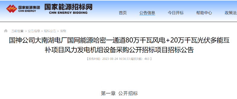 公告顯示,國網(wǎng)能源哈密一通道80萬千瓦風(fēng)電+20萬千瓦光伏多能互補(bǔ)項(xiàng)目場址位于新疆哈密大南湖地區(qū),工程場址中心距哈密市直線距離約96km,呈不規(guī)則多邊形,占地面積約165.05km²,風(fēng)電場擬安裝128臺(tái)6.25MW風(fēng)力發(fā)電機(jī)組,總裝機(jī)容量800MW,共分為兩個(gè)標(biāo)段:A標(biāo)段400MW,B標(biāo)段400MW。本項(xiàng)目計(jì)劃于2023年9月30日前開工(暫定);2024年6月30日前全容量并網(wǎng)發(fā)電。(暫定)
