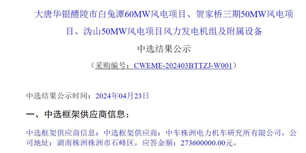 中車株洲電力機(jī)車研究所有限公司成功中標(biāo)大唐華銀醴陵市白兔潭60MW風(fēng)電項目、賀家橋三期50MW風(fēng)電項目、溈山50MW風(fēng)電項目,中標(biāo)價格為273600000.00元。