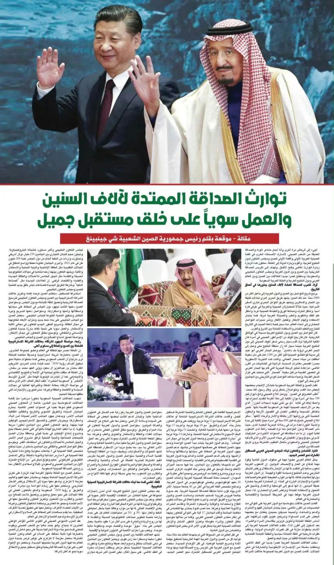12月8日,在抵達(dá)利雅得出席首屆中國(guó)-阿拉伯國(guó)家峰會(huì)、中國(guó)-海灣阿拉伯國(guó)家合作委員會(huì)峰會(huì)并對(duì)沙特進(jìn)行國(guó)事訪問之際,國(guó)家主席習(xí)近平在沙特《利雅得報(bào)》發(fā)表題為《傳承千年友好,共創(chuàng)美好未來(lái)》的署名文章。