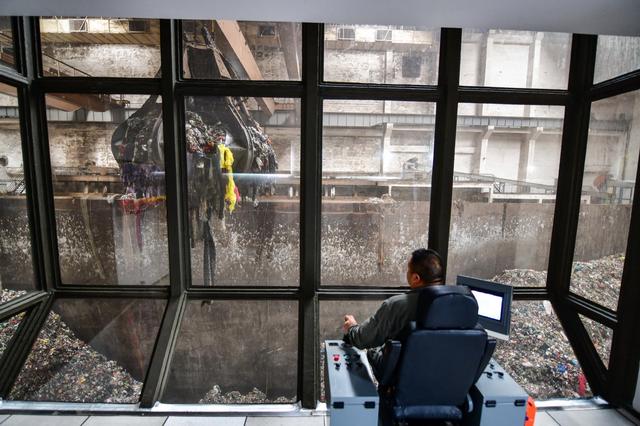 9月19日,在山東啟迪濟能環(huán)??萍加邢薰?,工作人員在控制室內(nèi)操作設備吊運垃圾。