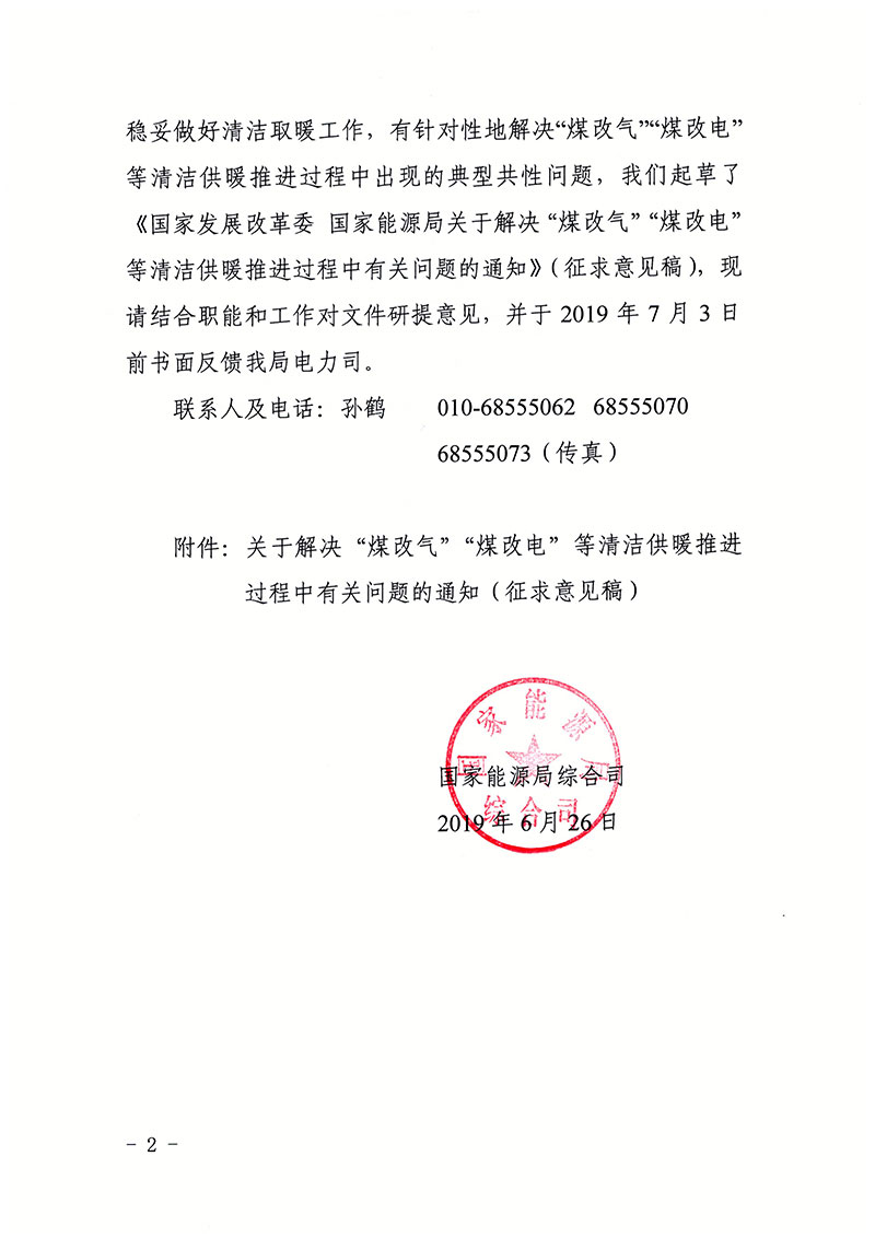 國家能源局綜合司征求《關(guān)于解決“煤改氣”“煤改電”等清潔供暖推進過程中有關(guān)問題的通知》意見的函
