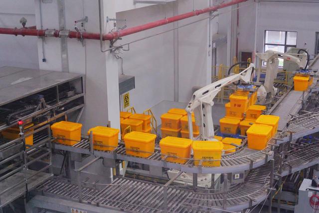 當一輛裝載著醫(yī)療廢物的運輸車進入廠區(qū)后,車廂門一打開,負責卸貨的機械臂便迅速啟動,通過自身配備的攝像頭對周轉箱進行拍照識別并完成自動抓取,裝有醫(yī)療廢物的黃色周轉箱隨即被放置于輸送線上。為了保證各個環(huán)節(jié)的無縫對接,園區(qū)特別定制了24000個固定尺寸的周轉箱,確保從收集、運輸?shù)教幚淼娜^程順利進行。