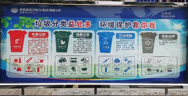 中國電力網(wǎng)訊(通訊員 李娟攝影報道)為倡導(dǎo)綠色生態(tài)、健康環(huán)保的生活方式,進(jìn)一步倡導(dǎo)垃圾分類理念,近日,淳化供電分公司更新公司文化宣傳欄,對有害垃圾、易腐垃圾、可回收垃圾、其他垃圾等通過圖文并茂的方式做了詳細(xì)說明,通過宣傳推廣,營造人人關(guān)心垃圾分類、踐行垃圾分類的良好氛圍,讓"綠色、環(huán)保、低碳"的理念深入人心,從不而斷提高大家自覺愛護(hù)環(huán)境衛(wèi)生的意識,讓垃圾分類從口號變?yōu)榱?xí)慣。