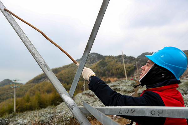 天空中時(shí)不時(shí)飄下來(lái)的小雪花染白了巡線員的鬢發(fā)、睫毛,甚至掉進(jìn)脖子里,凍得人直打哆嗦。連續(xù)幾個(gè)小時(shí)的工作,巡線員們的手被凍得通紅,只能搓搓手、哈哈氣。經(jīng)過(guò)幾個(gè)小時(shí)的努力,電力工人終于完成了這一條線路的巡視,消除了潛在的安全隱患。據(jù)了解,由于易覆冰區(qū)域均處在海拔720多米的高山上,上山、下山費(fèi)時(shí)費(fèi)力,因此寒潮期間,巡線人員每天起碼要走5個(gè)多小時(shí)的山路。