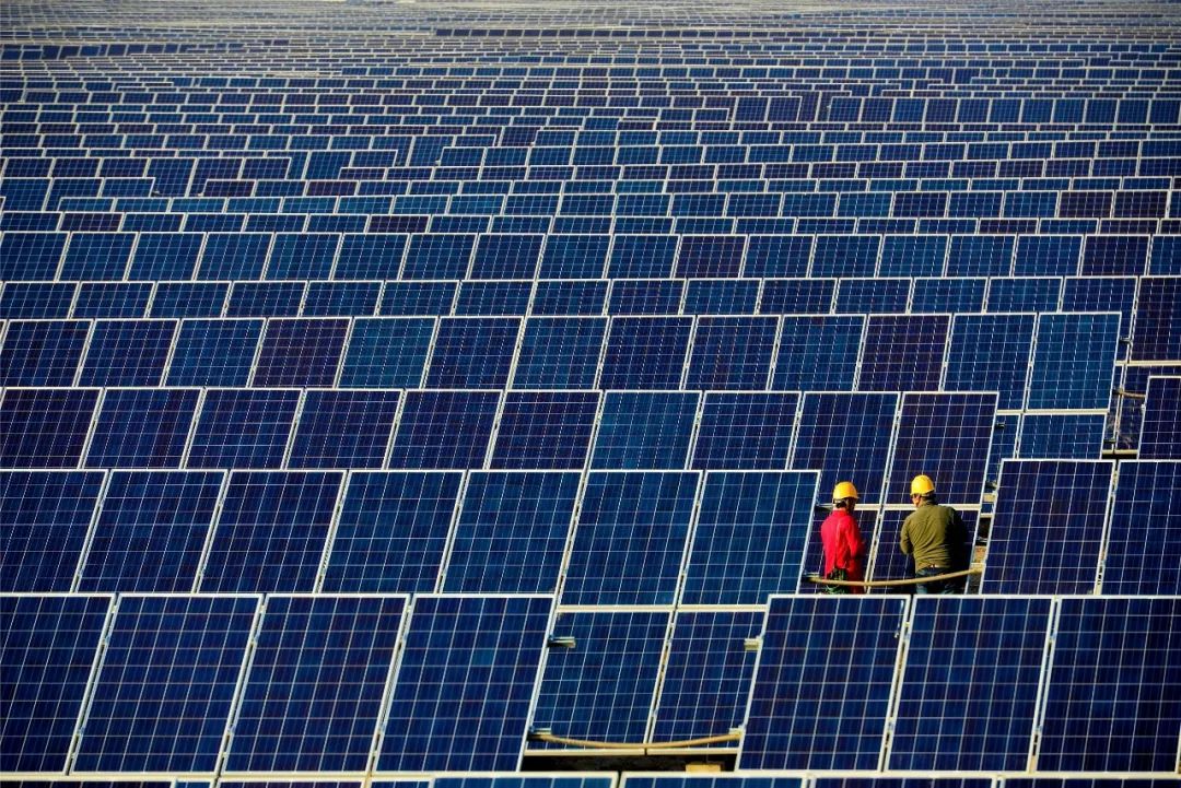 國(guó)家電網(wǎng)甘肅電力連心橋共產(chǎn)黨員服務(wù)隊(duì)隊(duì)員在光伏電站開(kāi)展檢查服務(wù)。