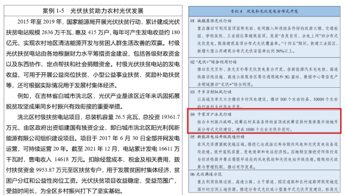 1、長期來看,鄉(xiāng)村振興是戶用光伏發(fā)展最大的機遇,分布式光伏將在農村的能源轉型中發(fā)揮重要作用!1)國家能源局“戶用光伏+鄉(xiāng)村振興”規(guī)劃2022年6月,國家發(fā)改委、國家能源局、財政部等九部委聯(lián)合下發(fā)《“十四五”可再生能源發(fā)展規(guī)劃》,特別提出:千家萬戶沐光行動!結合鄉(xiāng)村振興戰(zhàn)略,統(tǒng)籌農村具備條件的屋頂或統(tǒng)籌安排村集體集中場地開展分布式光伏建設,建成1000個左右光伏示范村。