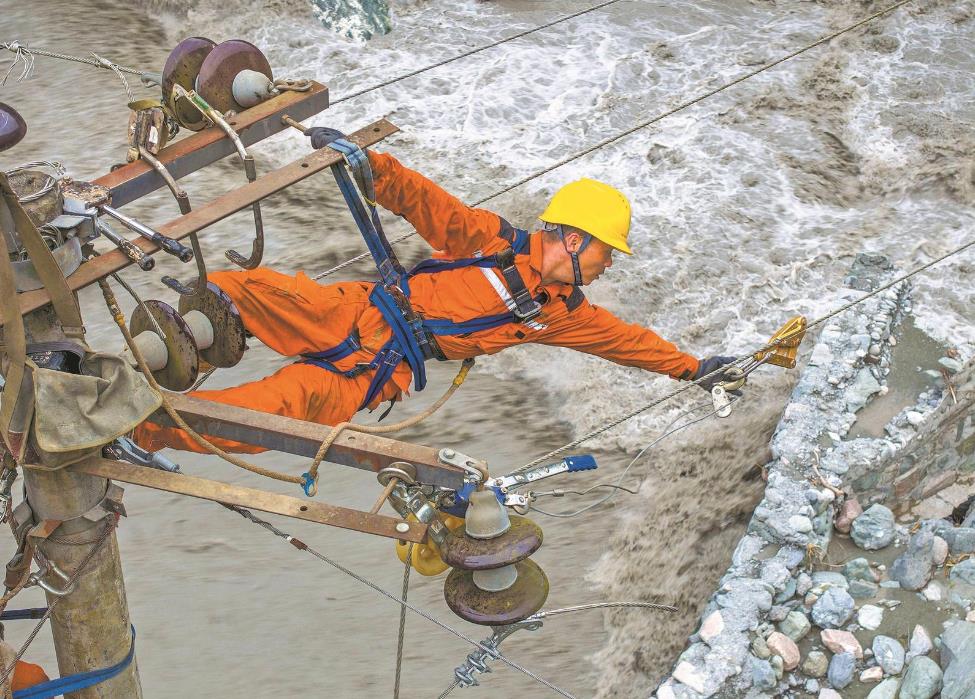 綿陽(yáng)供電公司增援平武縣電網(wǎng)搶險(xiǎn)人員搶修10千伏黃羊線(xiàn)受損線(xiàn)路,于7月27日19時(shí)恢復(fù)線(xiàn)路供電。田海 攝