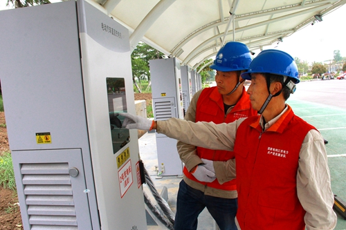 中國(guó)電力網(wǎng)訊 5月13日,江蘇連云港市東??h供電公司駝峰供電所服務(wù)人員趙孫華、何文軍在縣開(kāi)發(fā)區(qū)花卉市場(chǎng)門前檢查電動(dòng)汽車充電樁運(yùn)行情況。