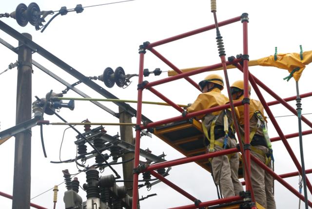 雙絕緣腳手架加旁路電纜帶電作業(yè)現(xiàn)場 葉凌云 攝
