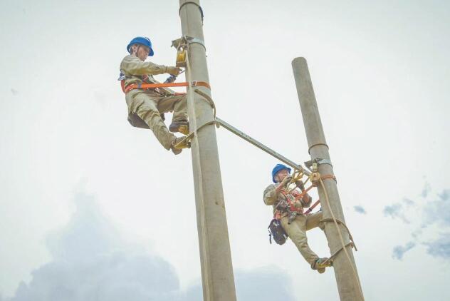 9時(shí)許,室外溫度已超過30攝氏度,隊(duì)員們?cè)跅U上桿下忙碌著。地面上,隊(duì)員邱榮軍轉(zhuǎn)動(dòng)線盤將導(dǎo)線一圈圈展開進(jìn)行放線后,隊(duì)員蔣院生和邱德生拖拽導(dǎo)線,肩扛手拉著將導(dǎo)線牽引到電桿下方,隊(duì)員陳秋德和王發(fā)揮則操作牽引機(jī)將導(dǎo)線牽引上桿。桿上作業(yè)的陳志強(qiáng)等4名隊(duì)員迅速將導(dǎo)線吊拽到電桿橫擔(dān)上,并同步使用緊線鉗收緊導(dǎo)線。