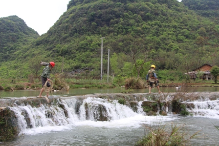 在四十工壩村外的河灘上,春水已漲過(guò)了河壩,配電班員工小周和同事們要到河對(duì)面的電桿上更換絕緣子,他們肩扛配件、手拿工具,赤足趟水過(guò)河,驚飛了河中嬉戲的鴨子,小周和同事戲說(shuō):“春江水未暖,我與鴨先知···”