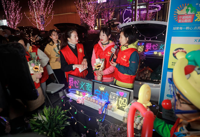 中國電力網(wǎng)訊 “小姐姐,過來看看,我們的土雞蛋特別好,我們的鮮花很漂亮!”11月22日晚,盡管天空飄著細(xì)雨,天氣也異常寒冷,但是鄞州萬象匯廣場門口的公益助殘志愿者愛心市集卻異常熱鬧,一輛輛汽車的后備箱放著各種義賣物,一群志愿者早早地在這里準(zhǔn)備著迎接來往的行人。其中有一群穿著紅馬甲的電力人,他們就是國網(wǎng)寧波市鄞州區(qū)供電公司“寧波媽媽”公益團(tuán)隊,向客人吆喝的就是剛剛獲得全國文明家庭的“寧波媽媽”張亞芬。