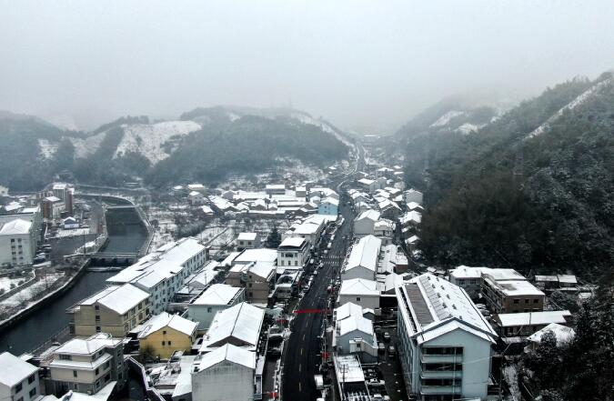 以四明山鎮(zhèn)為中心的天空里,雪花飛舞。環(huán)顧四周,大大小小的山頭已經(jīng)落滿了積雪,壓得竹林深深地彎下了腰,鄉(xiāng)間白墻黛瓦的屋檐上,已經(jīng)掛滿了長長的冰凌,推開窗戶哈一口白氣,就能感受到冬天的寒冷。