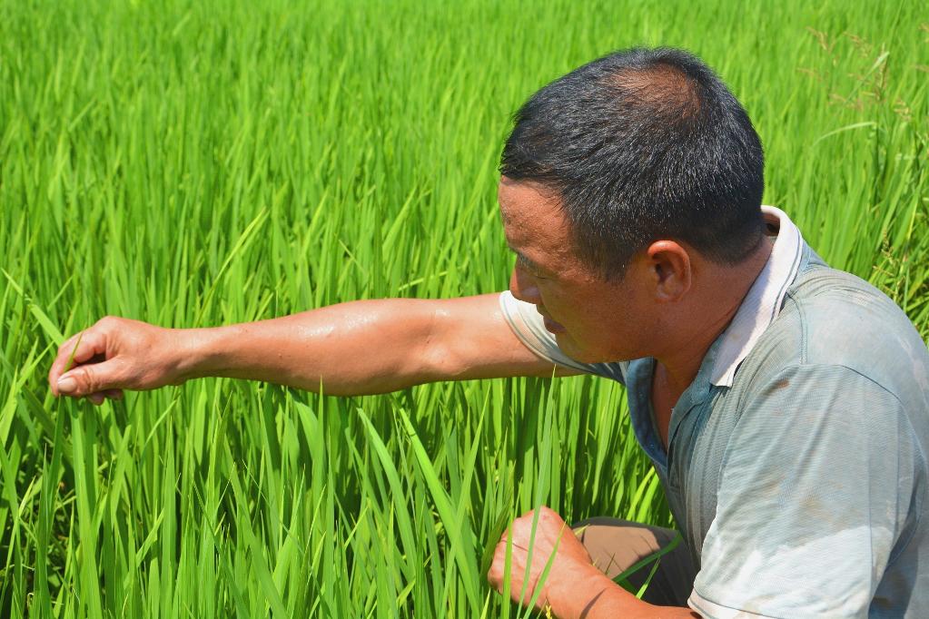江西信豐縣種糧大戶張四生蹲在田頭查看水稻恢復情況。(受訪者供圖)